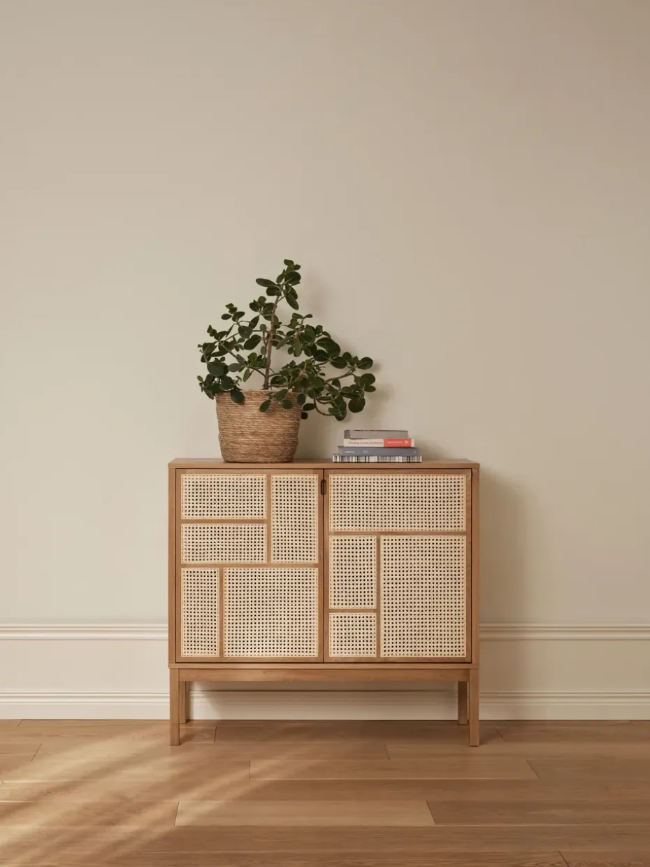 - Materiales: Materiales: MDF, poliuretano, chapa de roble, ratánAcabado: Lacado