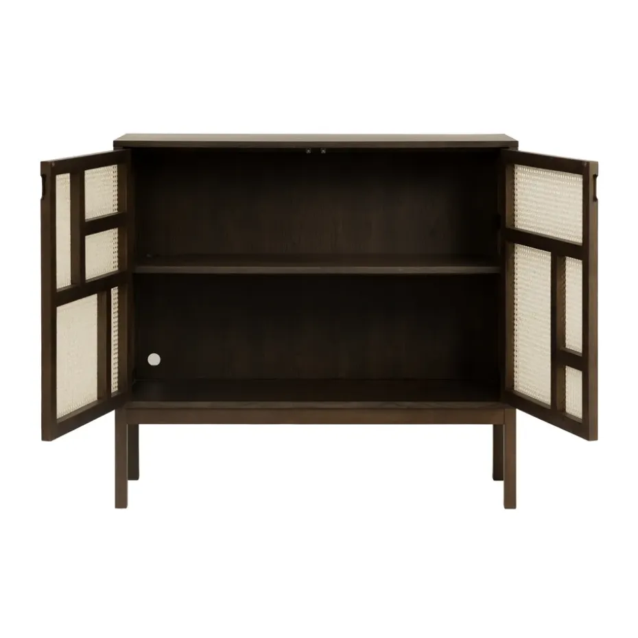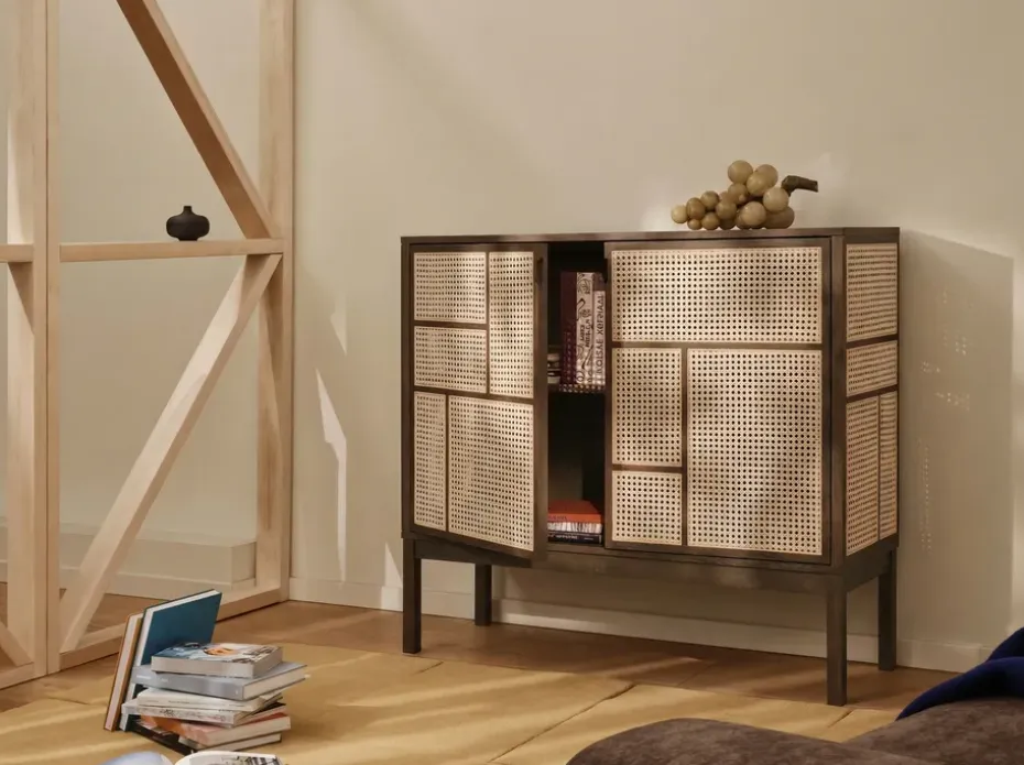 - Materiales: Materiales: MDF, poliuretano, chapa de roble, ratánAcabado: Lacado