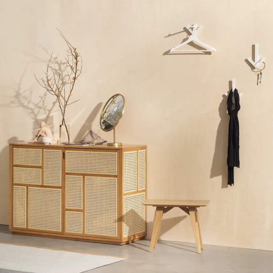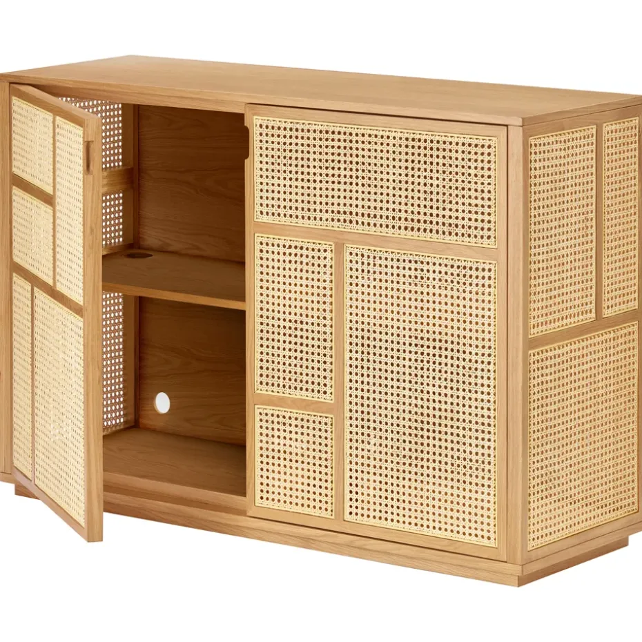 - Materiales: Chapa de roble, MDF, ratán